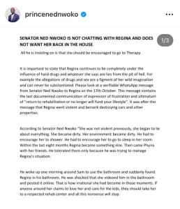 According to the Senator, Regina’s accusations—ranging from drug use to sexual misconduct—are “baseless, unprovable and deliberately concocted.” He linked her recent outbursts on social media to what he described as the lingering impact of drug abuse.