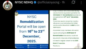 The National Youth Service Corps (NYSC) has announced that its online portal for the 2025 Batch ‘C’ remobilisation exercise will be open from December 16 to December 23, 2025.