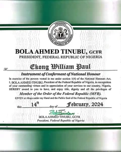 “In exercise of the powers vested in me under section 1(4) of the National Honours Act, I, BOLA AHMED TINUBU, President of the Federal Republic of Nigeria, in recognition of your outstanding virtues and in appreciation of your services to our country, Nigeria, HEREBY award to you to have, and enjoy title, dignity and all the privileges of Member of the Order of the Federal Republic (MFR).”